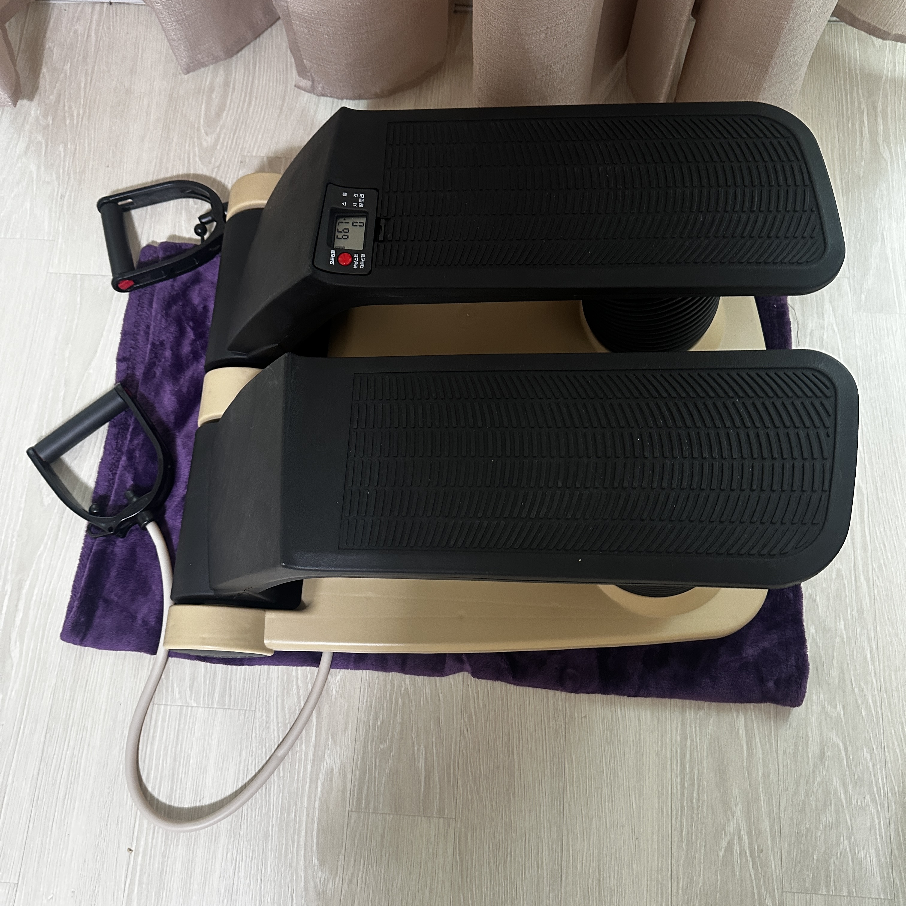 사용방법은 스탭을 바닥 끝까지 밟는게 아니고, 살짝살짝 밟는데, 중요한 것은 무릎이 아닌 허벅지로 타줘야됩니다. 그런데 허벅지에서 정말 쥐가 나는줄 알았습니다. 5분 겨우 탔는데 온몸에서 땀이 비오듯 흐르더라구요. 운동효과 제대로입니다. 저는 만보기 앱테크도 하는데 핸드폰이 걷는 걸로 인식해서 잘 모이기도 하더라고요. 뜻밖의 이득이랄까요.