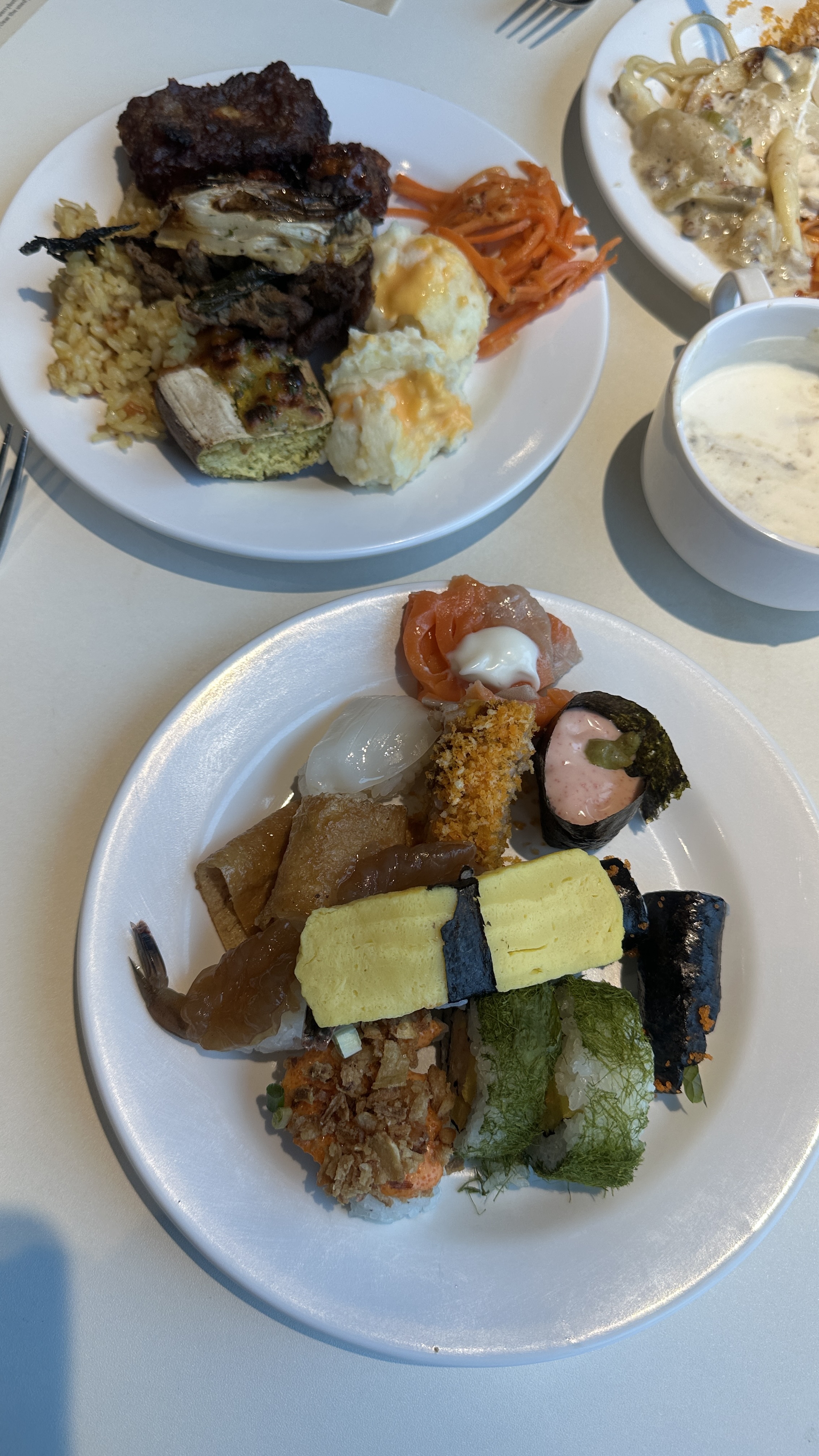 애슐리 퀸즈 팁은 의외로 스프가 정말 맛있는데요. 크램차우더 4숟갈에 양송이를 한 국자 섞으면 정말 맛있어요. 친구도 한입 먹어보고 맛있다고 자기도 그렇게 해서 먹더라고요. 저는 초밥류를 좋아해서 많이 먹었는데 배가 빠르게 불러서 그 점은 아쉬웠습니다.