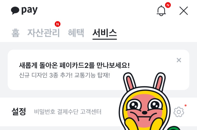 먼저 어플을 열고 설정으로 들어가서, 페이로 들어갑니다. 그리고 홈, 자산관리, 혜택, 서비스 중 맨 끝에 있는 서비스 버튼을 클릭해주세요. (맨 위 사진 참고)
