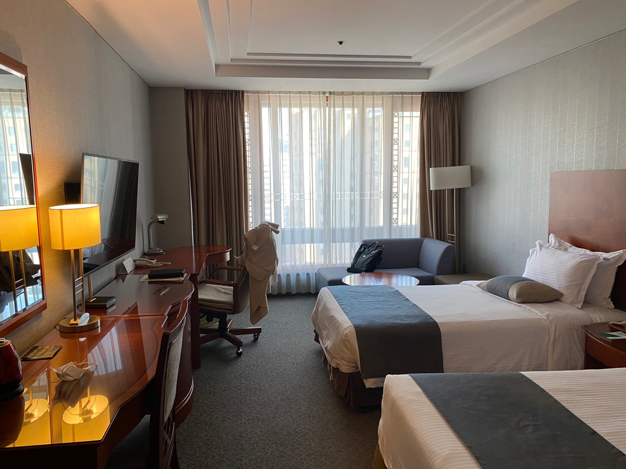 광화문 코리아나 호텔 디럭스 트윈 이용기 남깁니다. 최근에 지방에서 친구들이 올라와 같이 지낼 곳을 찾다가 여기가 괜찮은 듯 해서 예약했는데 생각보다 더 만족스러웠습니다. 아무래도 오래된 곳인만큼 연식이 느껴진다는 글들이 많아 고민을 좀 했었는데, 그런 느낌은 있지만 쾌적하고 청소도 잘되어있어 오히려 분위기 있는 것 처럼 느껴지더라고요.