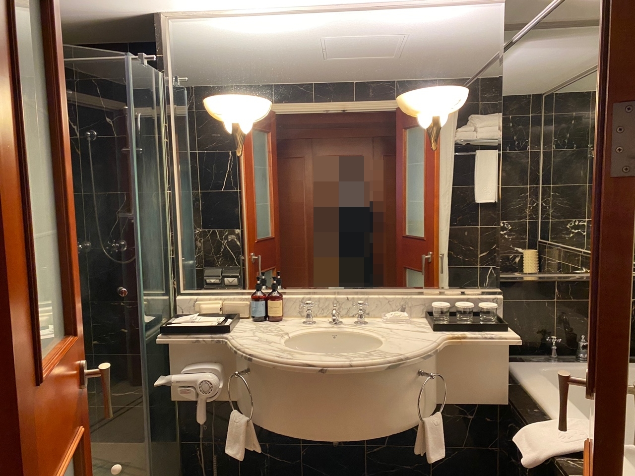 화장실도 넓고 깔끔하고요. 저는 화장실이 마음에 들더라고요. 예쁘지 않나요? 이 문이 잠굴 수 없고 꽉 닫히지 않는다는게 조금 흠이고 또 화장실도 방음이 잘 안되어 룸까지 소리가 들린다는 단점이 있기는 했지만요. 인테리어가 마음에 들었습니다.