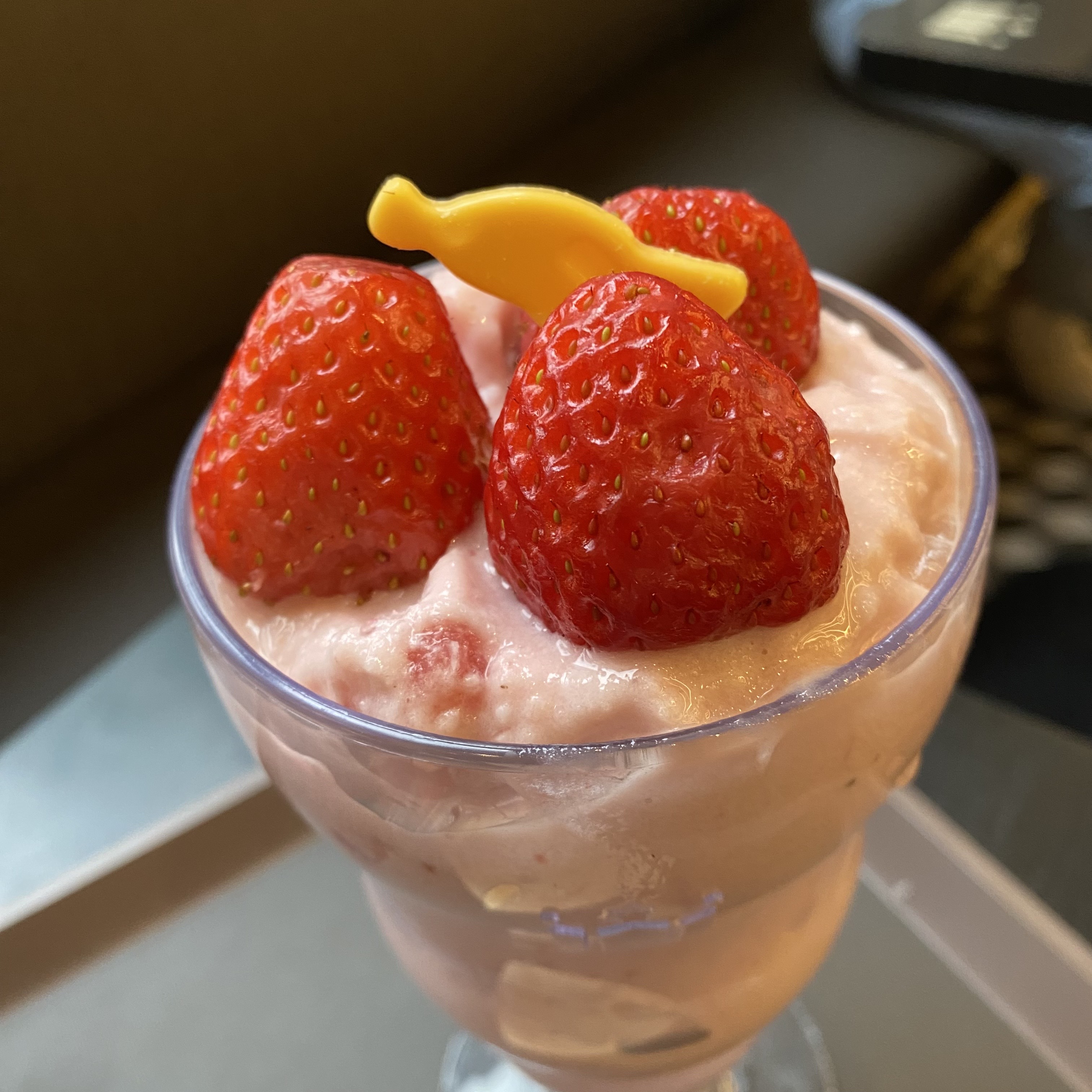 맛은 생각보다 달지 않고 딸기맛이 많이나고 바나나의 부드러움도 갖추고 있어 꽤 괜찮더라구요. 그리고 시원하다보니 아이스크림을 먹는 느낌도 나서 여름에 먹기도 좋을듯하고 기분전환하기도 딱입니다. 일단 컵도 예쁜데에 담겨나오고 위에 딸기가 3개나 올라가며 바나나모양 초콜릿도 있어 굉장히 신경쓴 느낌이고 비주얼도 정말 예뻤어요.